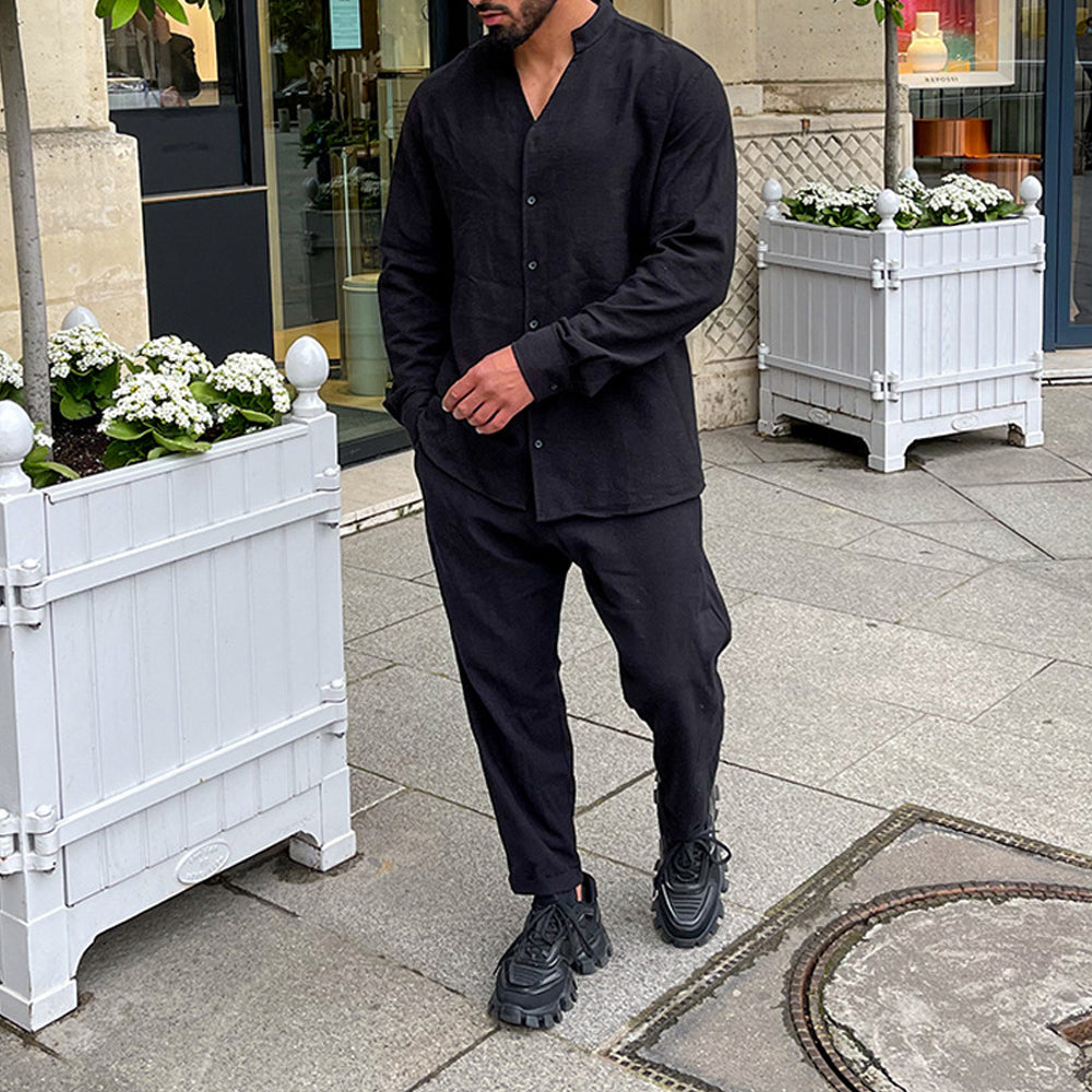 Men’s Solid Color V-Neck Long-Sleeve Shirt and Pants Two-Piece Set