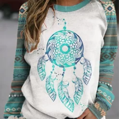 Women Retro Print Crew Neck Long Sleeve Sweatshirt Top