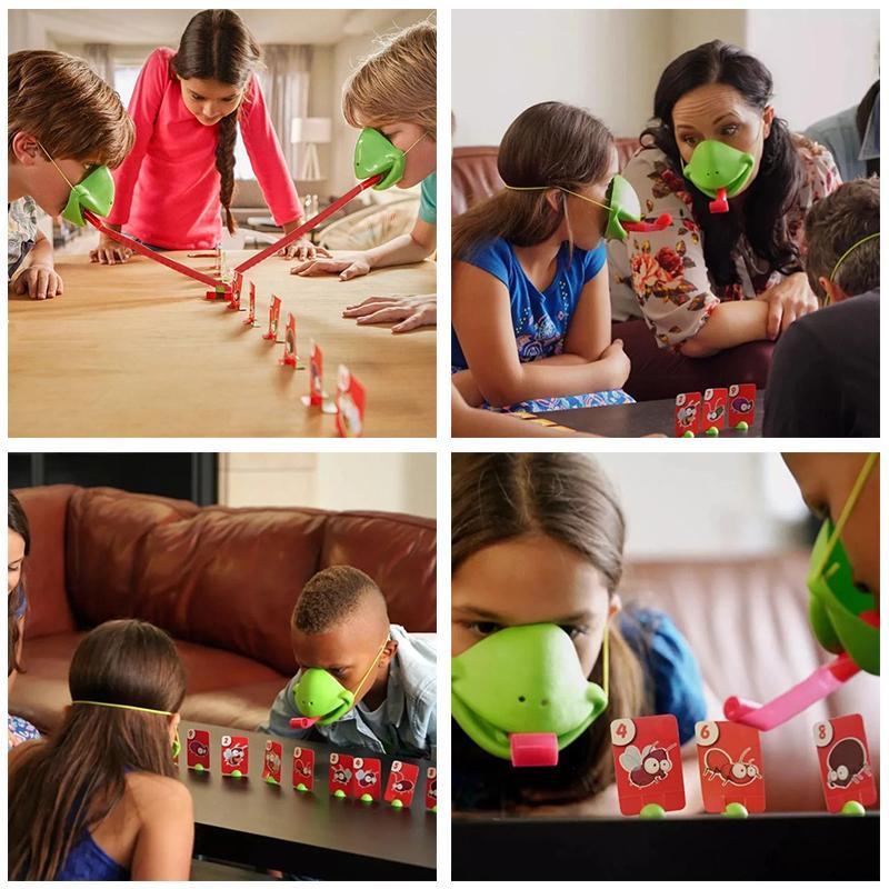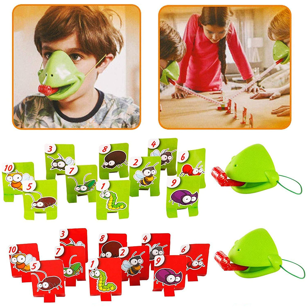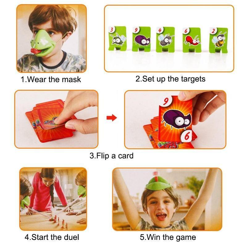 Both players in thissuperblyfun gamewear chameleon mouthmasks complete with extending red tongues.Similar to a party blower.puffing into the plastic tongue unfurls it for a quick strike.