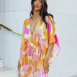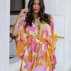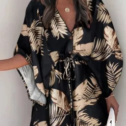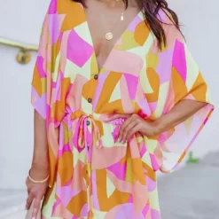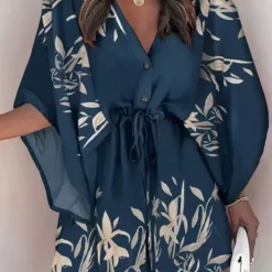 - The V-neck design elongates the proportion of the neck and visually shapes the perfect swan neck. Button fly. easy to put on and take off. Waist drawstring design. you can adjust the elastic at will. Irregular 把bat sleeves. very statement. with fashion print decoration. look very flattering and mature.