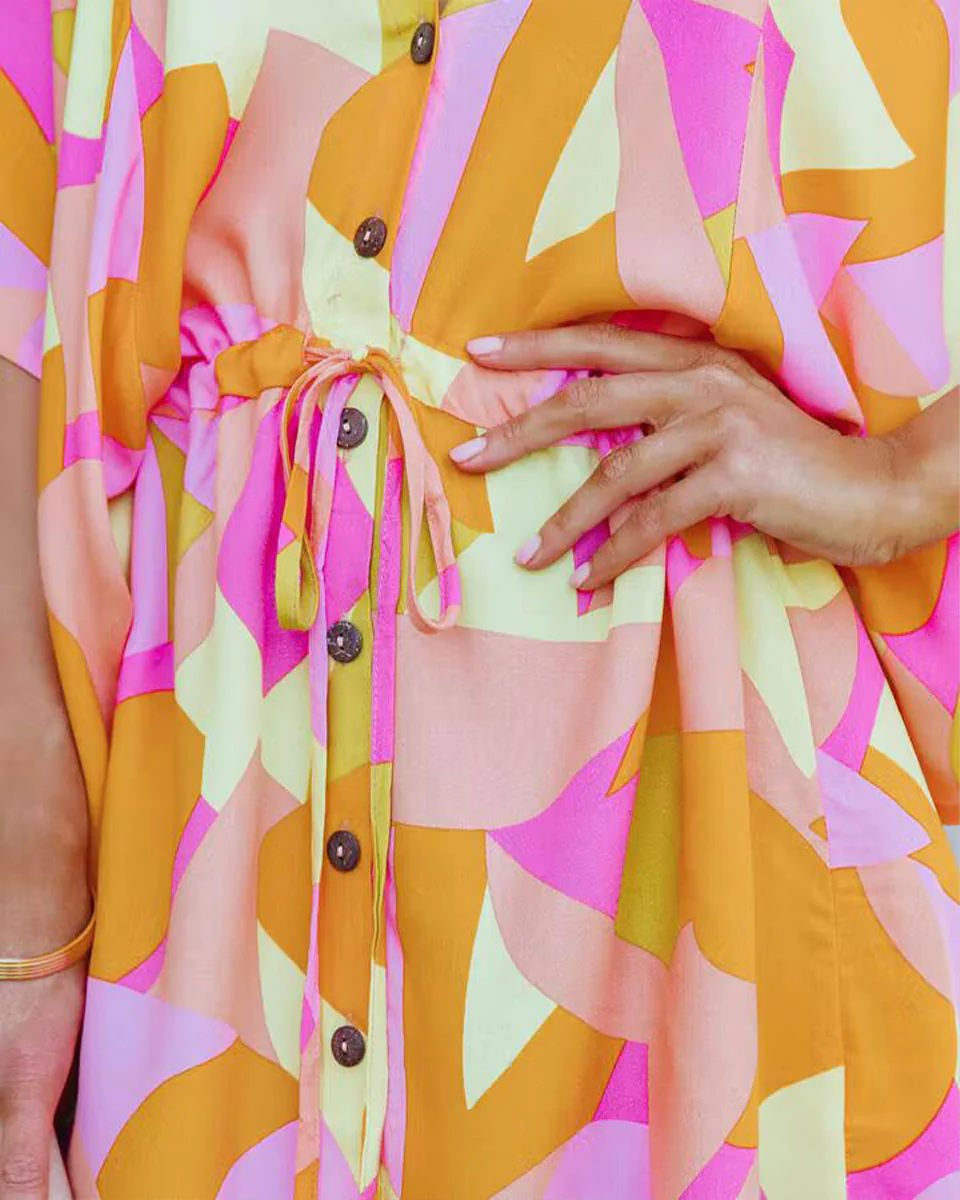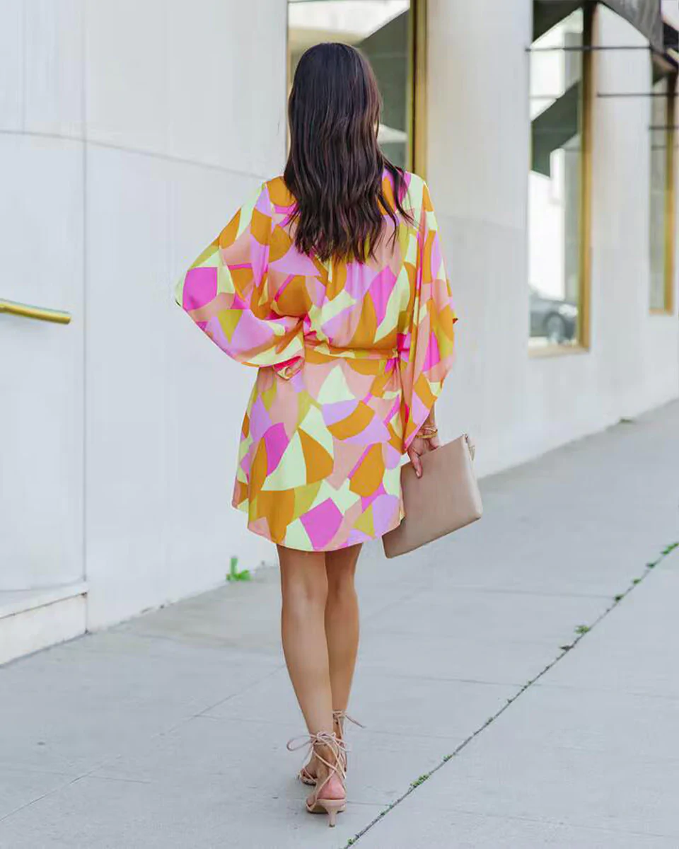 - 1*Printed V-Neck Bat Sleeve Button Drawstring Dress 2022 New