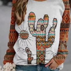 - Design: Long sleeve.crew neck.loose fit.pullover.retro geometry print.every women’s wardrobe needs at least one sweatshirt top. Refresh your everyday rotation with our new top from the latest collection.